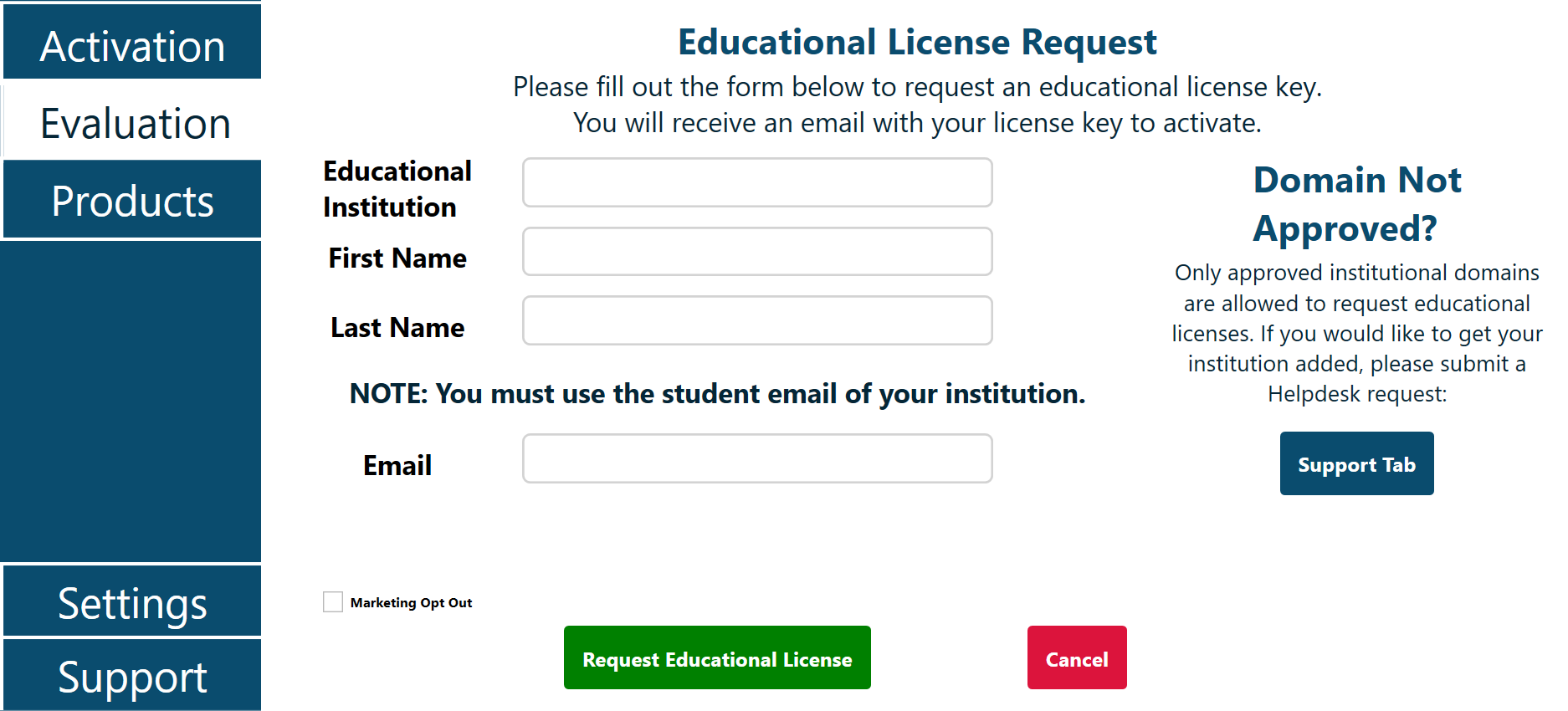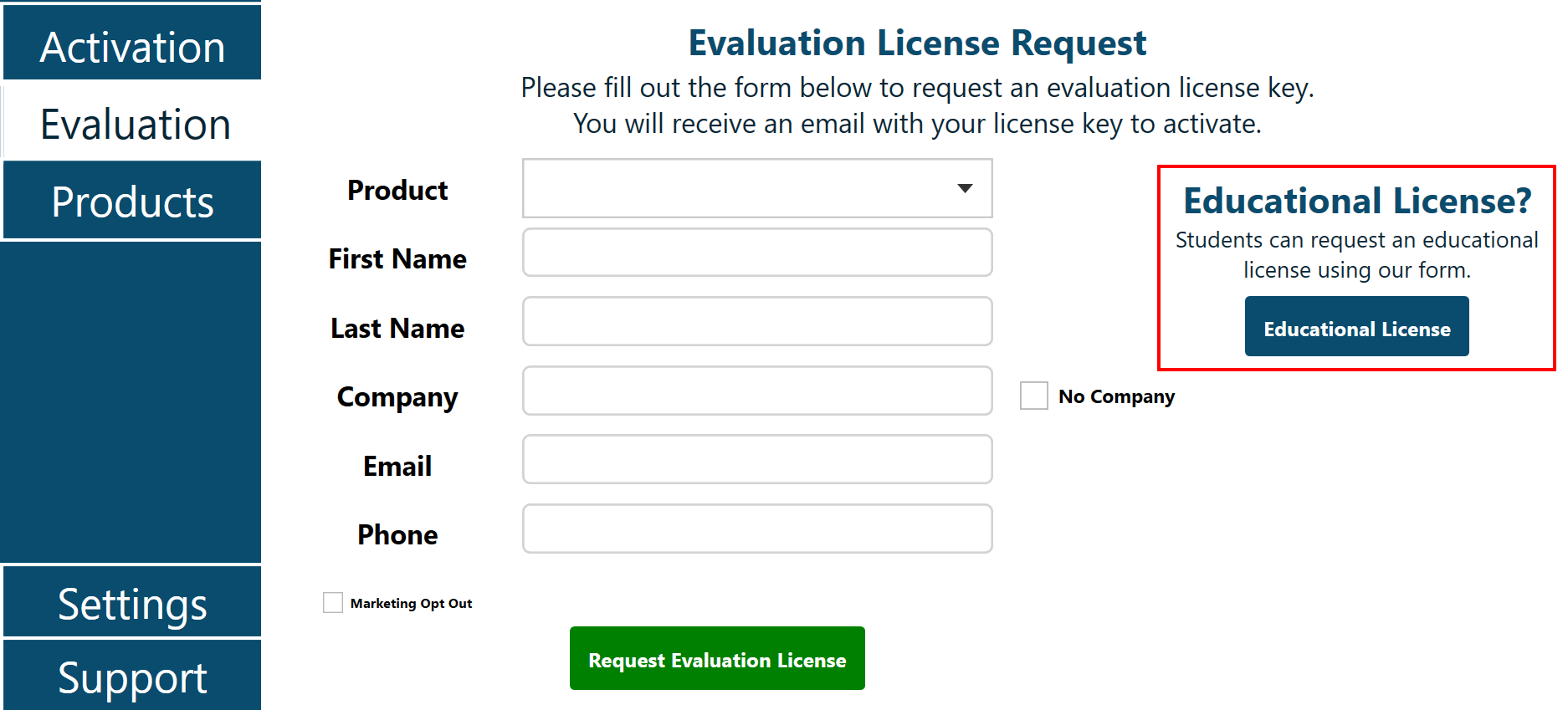 To request an educational licenses please install the software and navigate to the Evaluation tab within the License Manager.